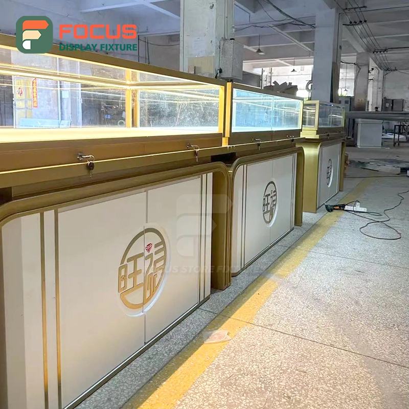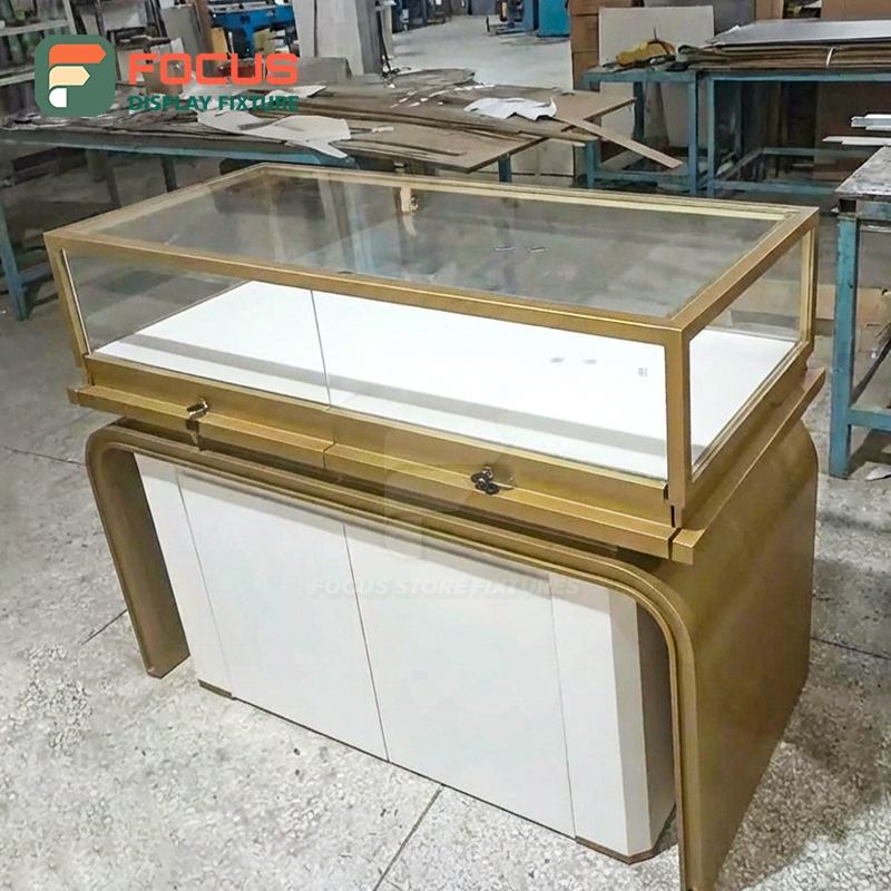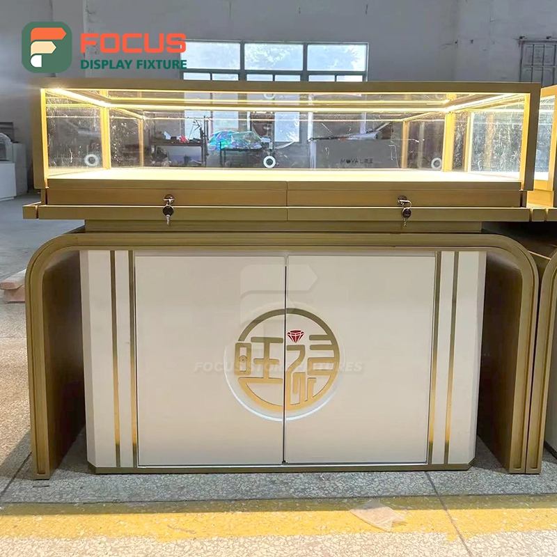 Luxury Wooden Jewelry Counter Glass Display Cabinet Jewelry Display Rack LED Light High End Showcase Unit