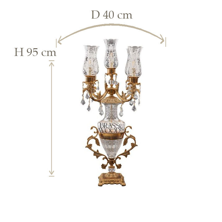 Luxury antique brass and crystal three arm table lamp with handmade decorative details and elegant timeless classic design