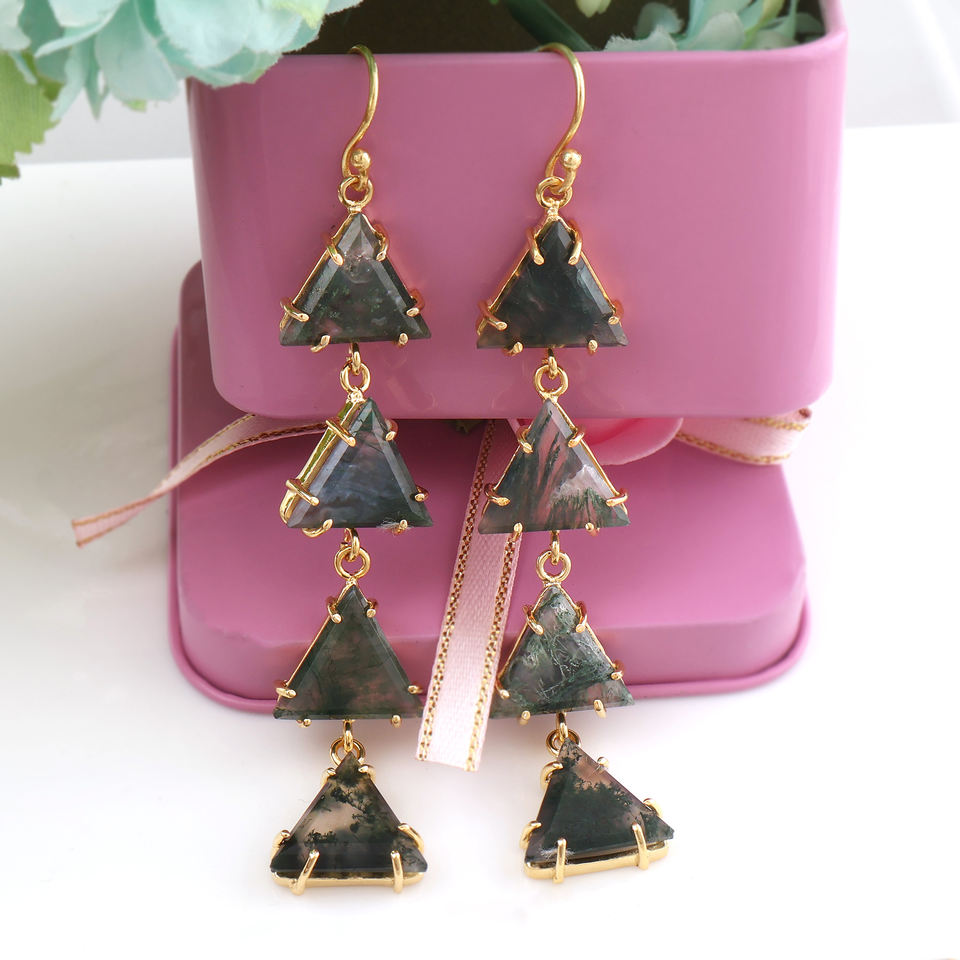 Luxury fashion jewelry natural moss agate gemstone dangler eardrop triangular shape handmade long gold hanging earrings