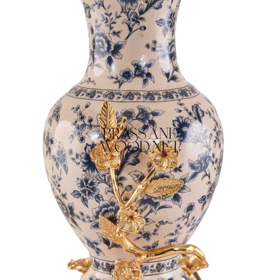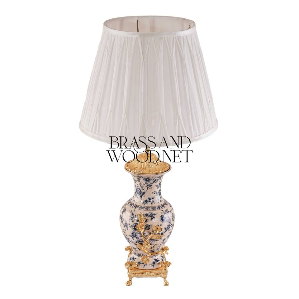 Luxury golden brass table lamp with floral porcelain base classic European design and elegant fabric shade