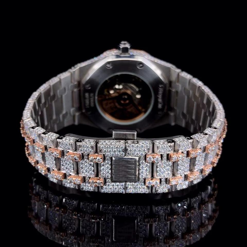 Luxury iced out diamond wristwatch round dial rose gold accents crystal bezel silver bracelet unisex fashion timepiece