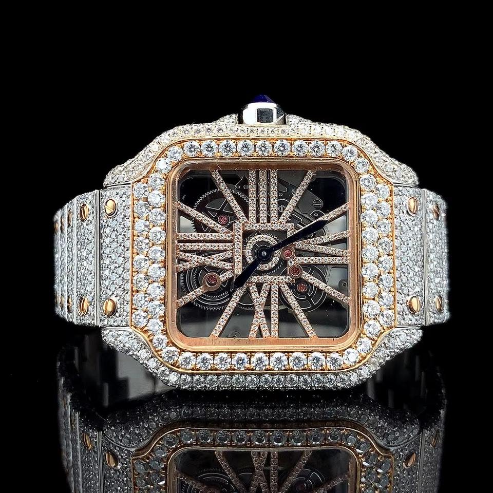 Luxury iced out skeleton square dial wristwatch rose gold diamond bezel full pave mens fashion mechanical timepiece