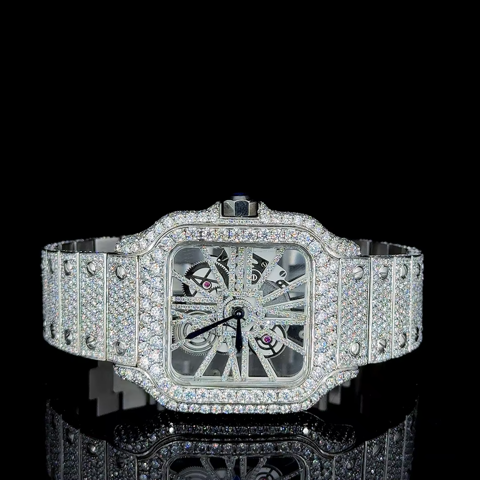 Luxury Iced Skeleton Stainless Steel Wristwatch Square Dial Crystal Bezel Diamond Accented Silver Bracelet Transparent Design