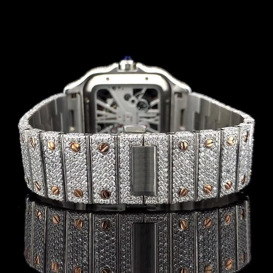 Luxury iced out skeleton wristwatch square dial with Roman numeral crystal bezel silver and rose gold bracelet unisex timepiece