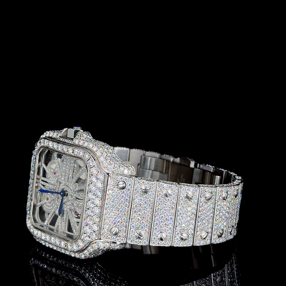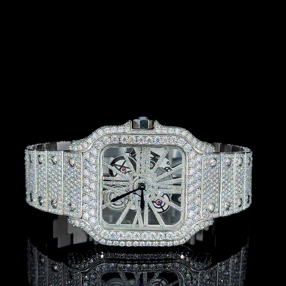 Luxury iced out skeleton wristwatch square dial crystal bezel silver bracelet transparent design unisex elegant timepiece