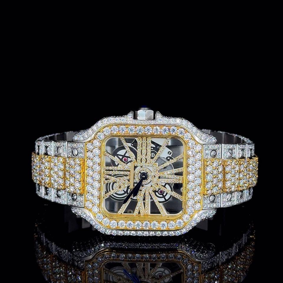 Luxury Seiko Quartz Iced Out Wristwatch Two Tone Design Skeleton Dial Diamond Studded Bracelet Elegant Men Fashion Timepiece