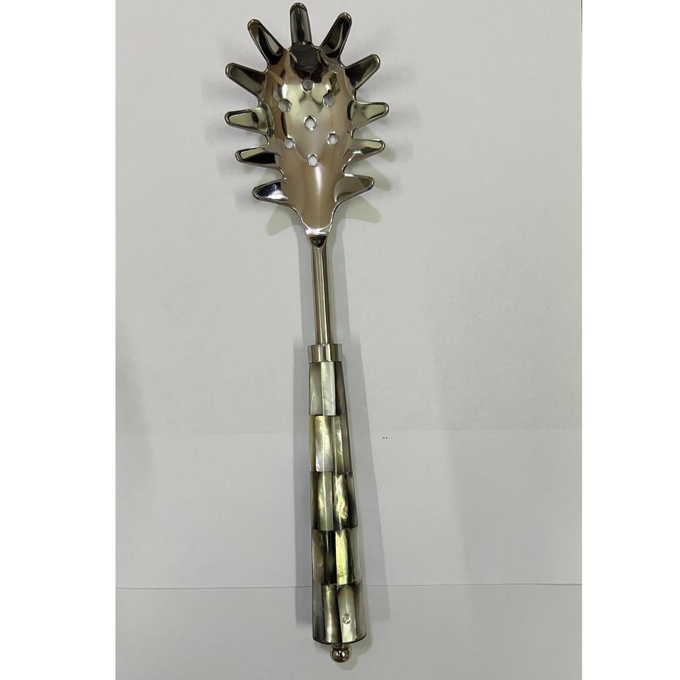 Luxury metal serving spoon with mother of pearl inlay elegant flat bowl design royal handle for buffet dinnerware and premium