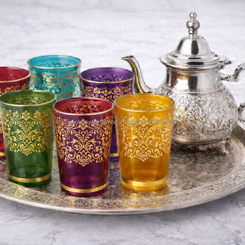 Luxury multi color Moroccan Tea Set 6 glasses one tray one teapot in gift box