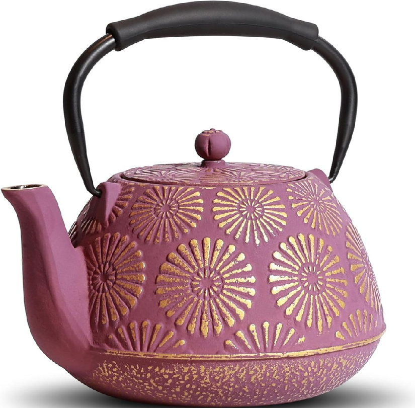 Luxury pink-golden embossed floral steel teapot with curved handle and matte finish, available at wholesale prices.