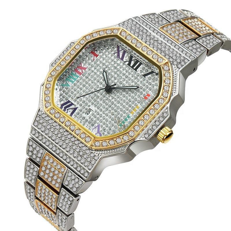 Luxury rainbow Roman Dial Iced Out Hip Hop Watch Quartz Eta Diamond Bust Down Stainless Steel Bling Bling Rapper Style