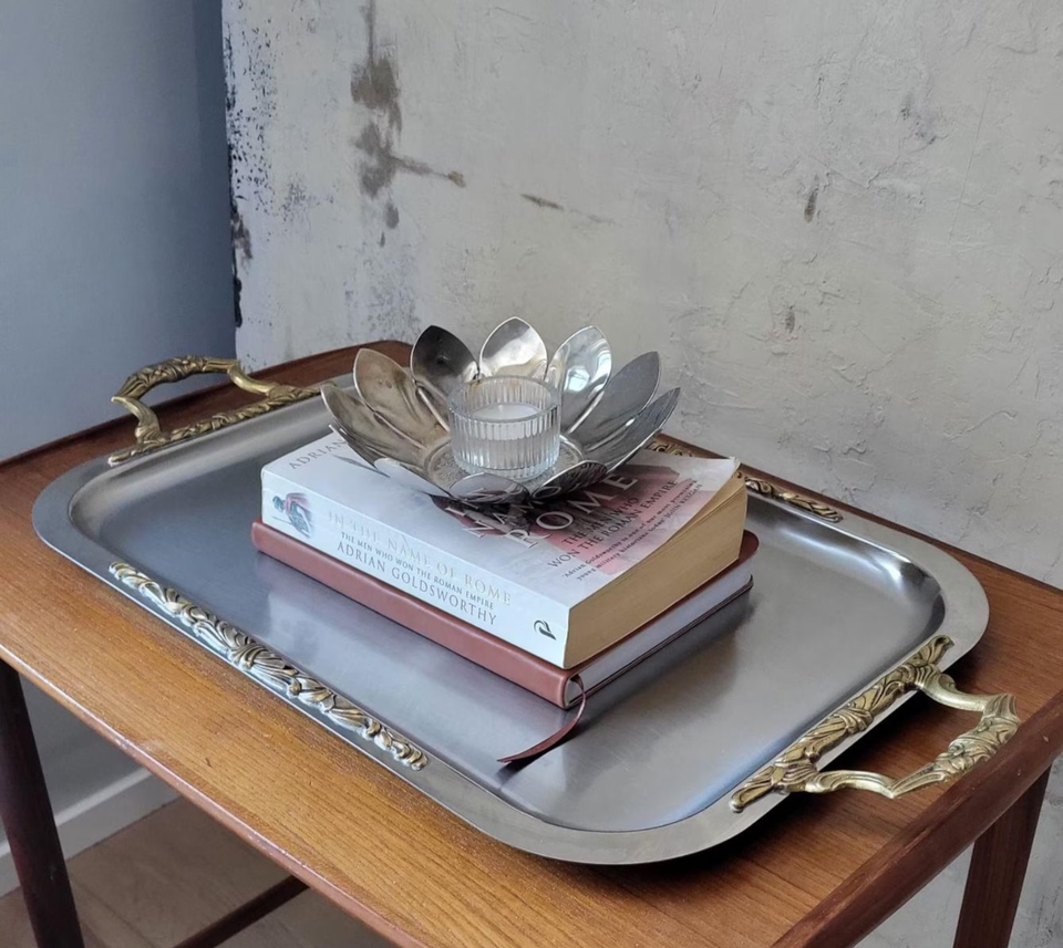 Luxury serving tray Rectangular metaltray Vintage serving tray Ornate metal tray Silver and gold tray Decorative serving platter