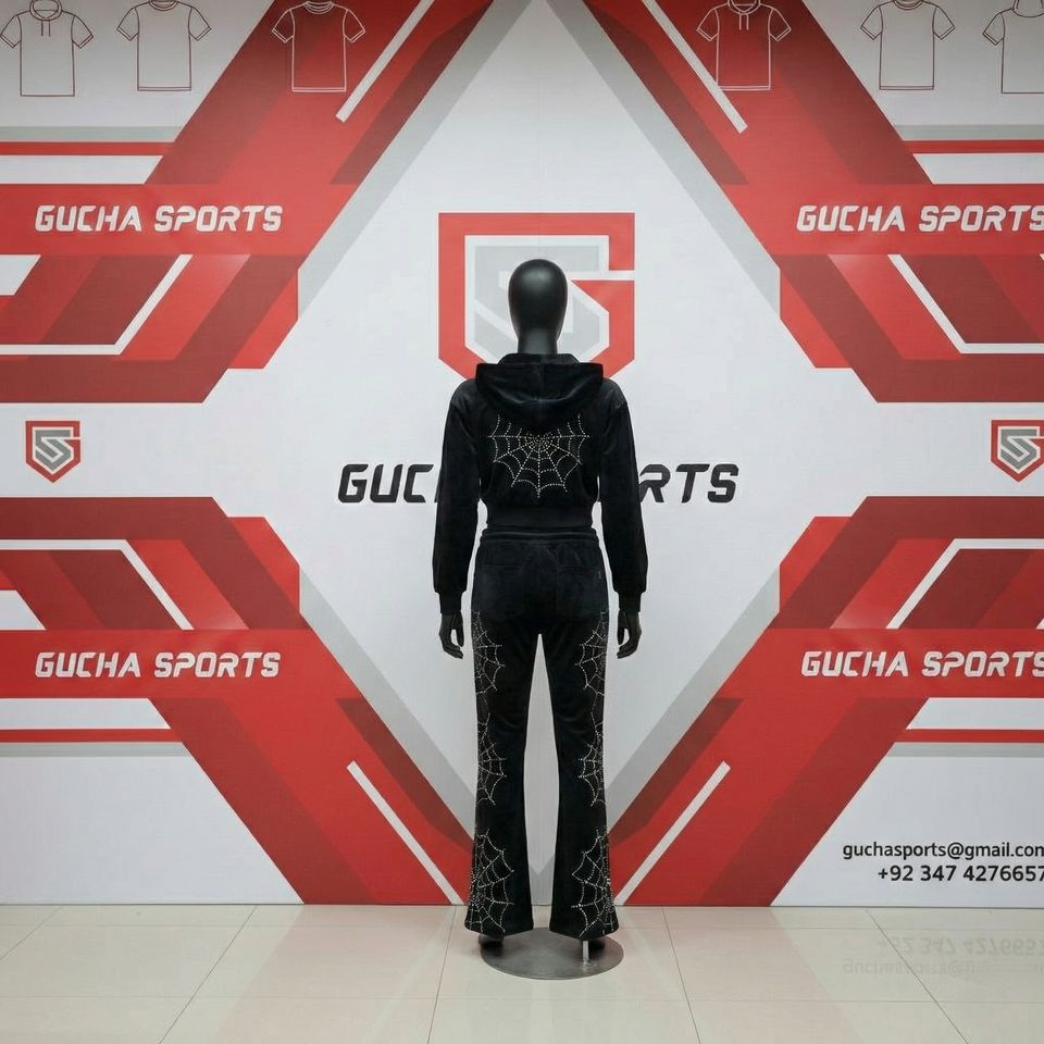 Luxury velvet tracksuit set with rhinestone print hoodie and joggers, soft feel, premium finish, streetwear fashion wear