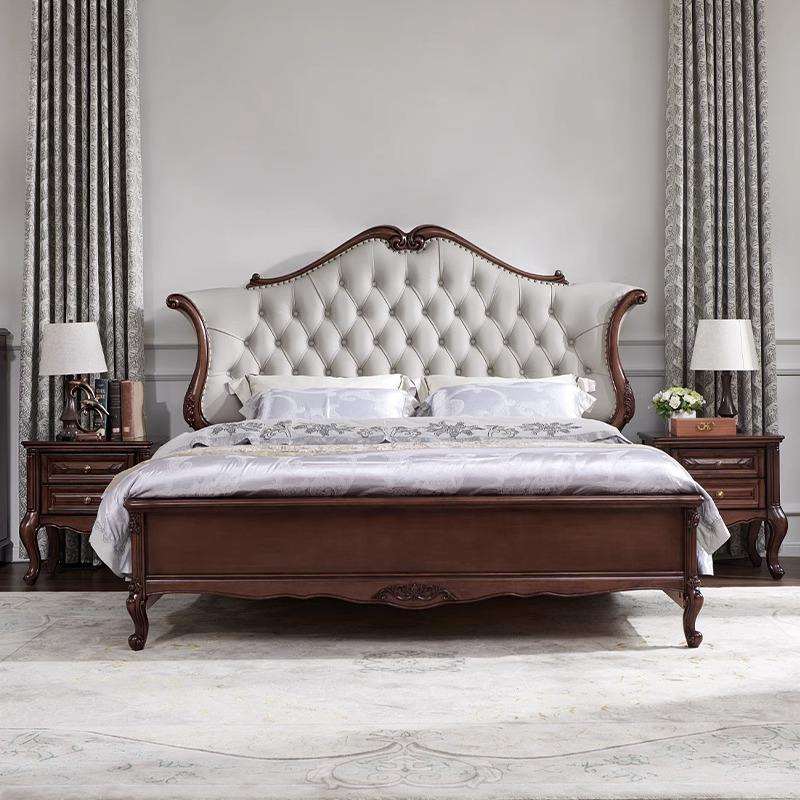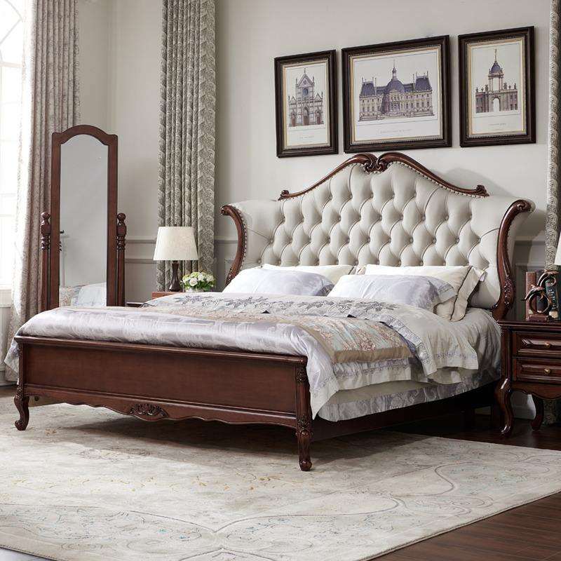 Luxury vintage style mahogany wood bed frame with upholstered headboard for indoor bedroom