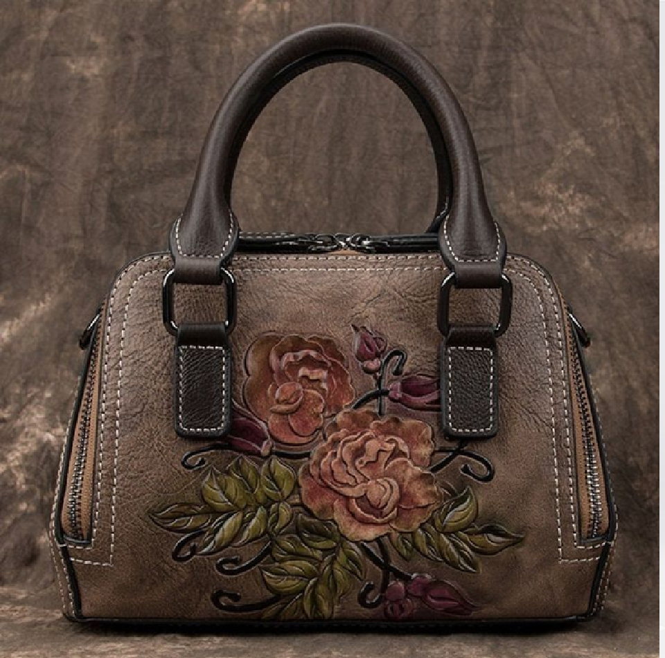 Luxury white leather bag with ruby red 3D floral and gold vine details. Available at wholesale prices.