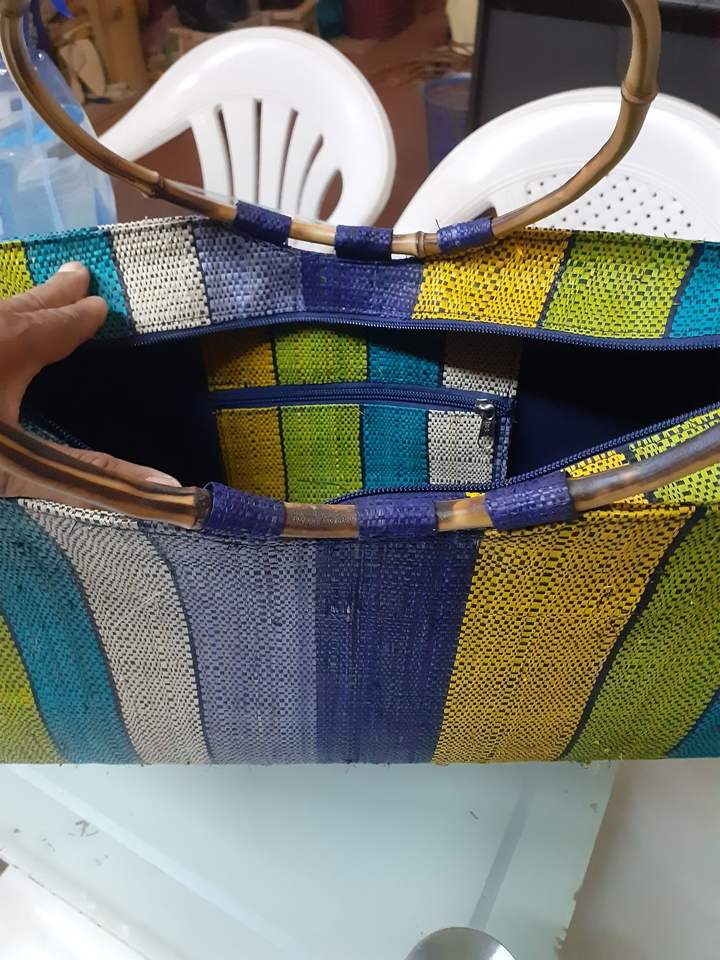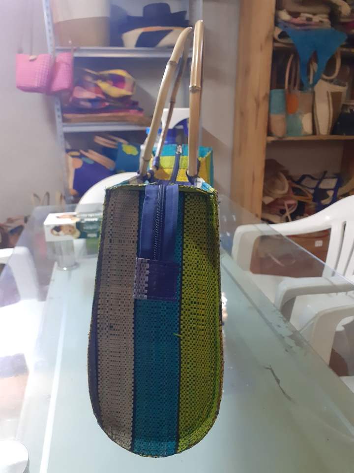 MADAGASCAR Trendy Fashion Multicolor Woven Raffia Handbag Two Straps Bamboo Bucket Pattern Embroidery Zipper Closure Inner