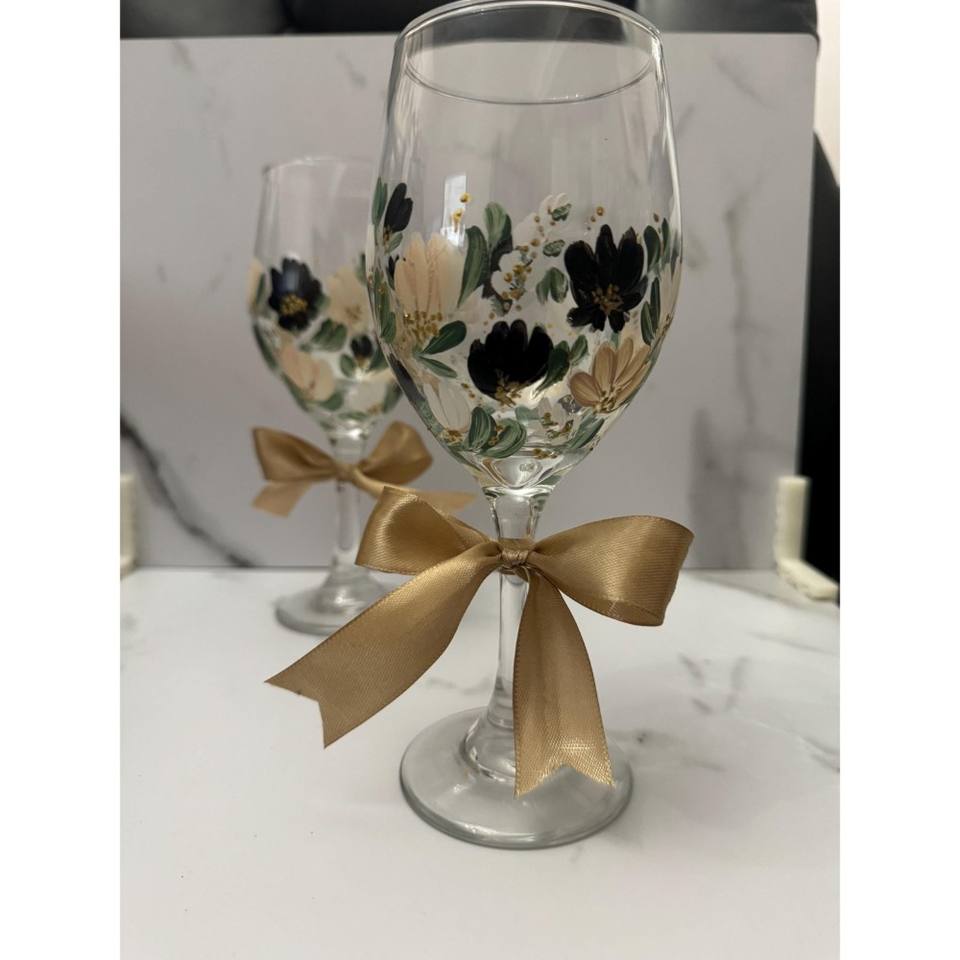 MARVELLOUS ! Custom Hand Painted Wine Glass Elegant Floral Glassware With Golden Ribbon Cute Bow