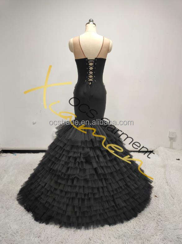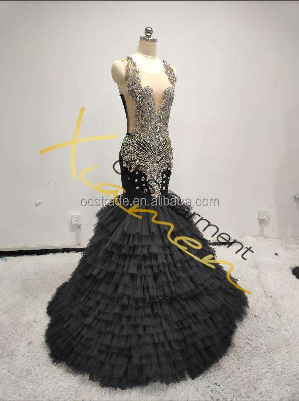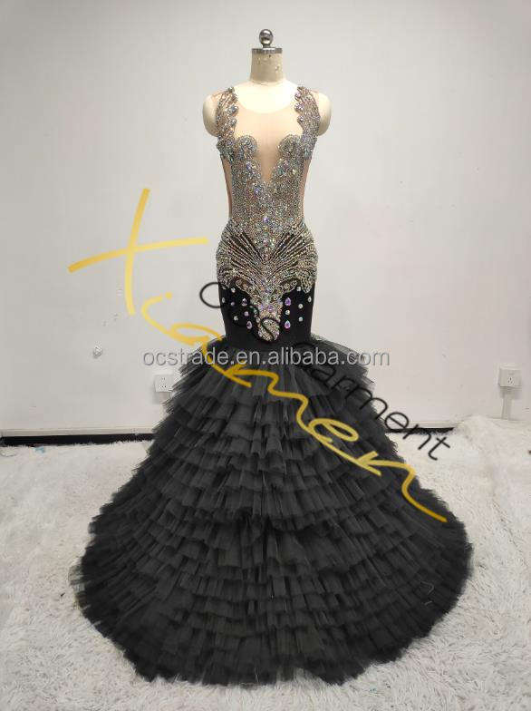 MF Fashion Sier AB Appliques Black Crystal Simple Voluminous Stiff Ball Gown Prom Beaded Ruffles Tulle Print Natural Sweep Train