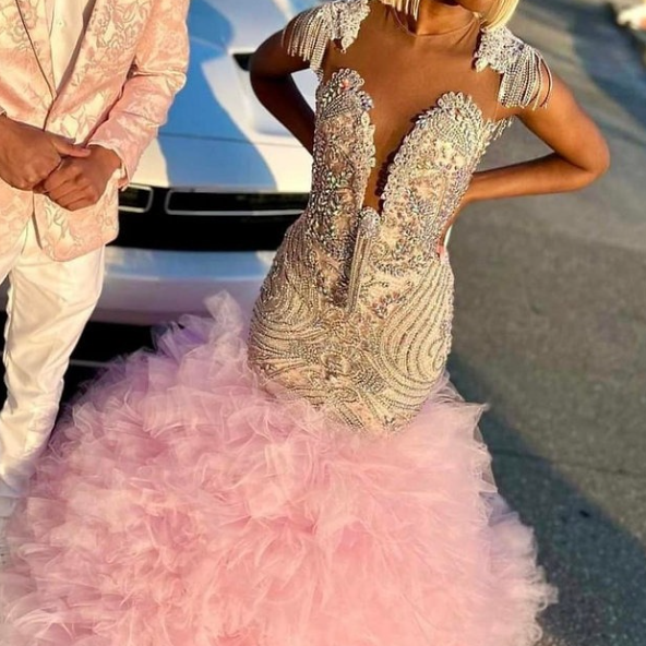 MF Luxury Crystal Rhinestone Applique Natural Waist Prom Dress Tassel Beaded Elegant Mesh Ruffles Party Evening Ball Gown