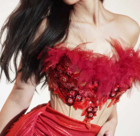MF Luxury Polyester Rhinestone Traditional Chinese Opera Ballroom Performance Wear Red Strapless Sexy Slit Women Sets Feather