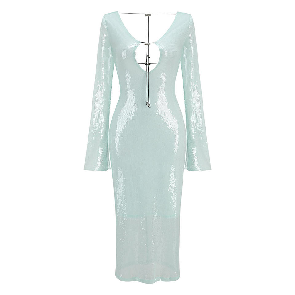 MF Sparkle Ladies Elegant Sexy Sequin Print V Neck Cut Out Backless Short Flare Sleeve Eco-Friendly Maxi Evening Dress