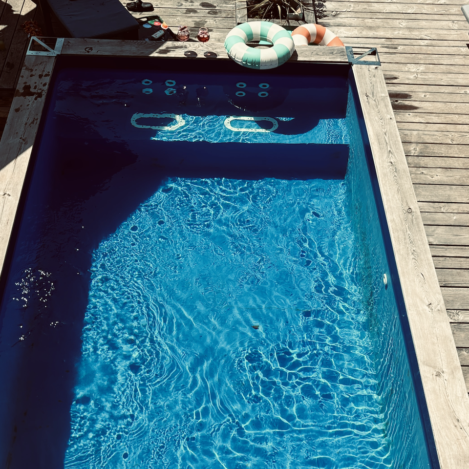 Residential Pools, Swimming Pools, Integrated filtration and balneotherapy, Slatted cladding, Powder coated steel angles, Semi-inground pool, Bench PoolType