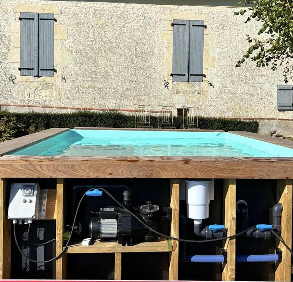 Pool, filter pump, Integrated Filtration and Balneotherapy, Semi-inground, Slatted cladding, Powder coated steel angles, Bench Pool, LinerAccessories