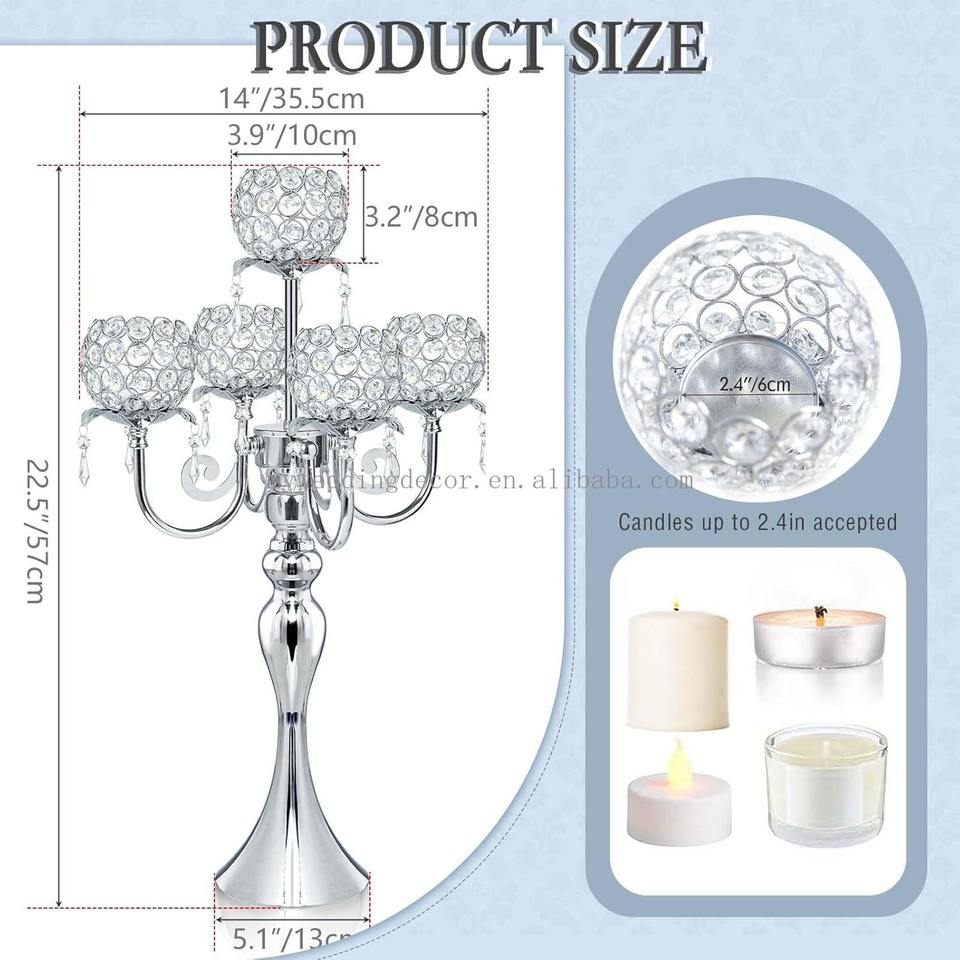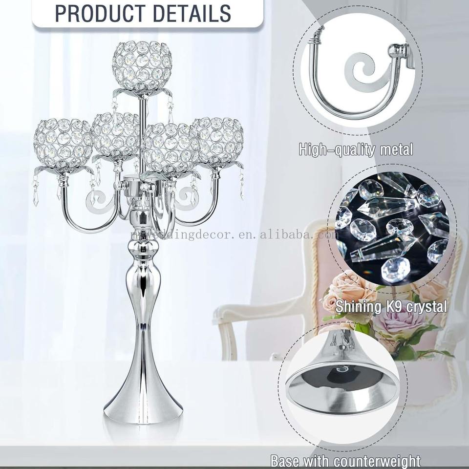 MOISSIC High Quality Wedding Pendant Metal Candle Holder Square Crystal Bowl 22-Inch Tall Wedding Table Centerpiece Gold 5 Arm