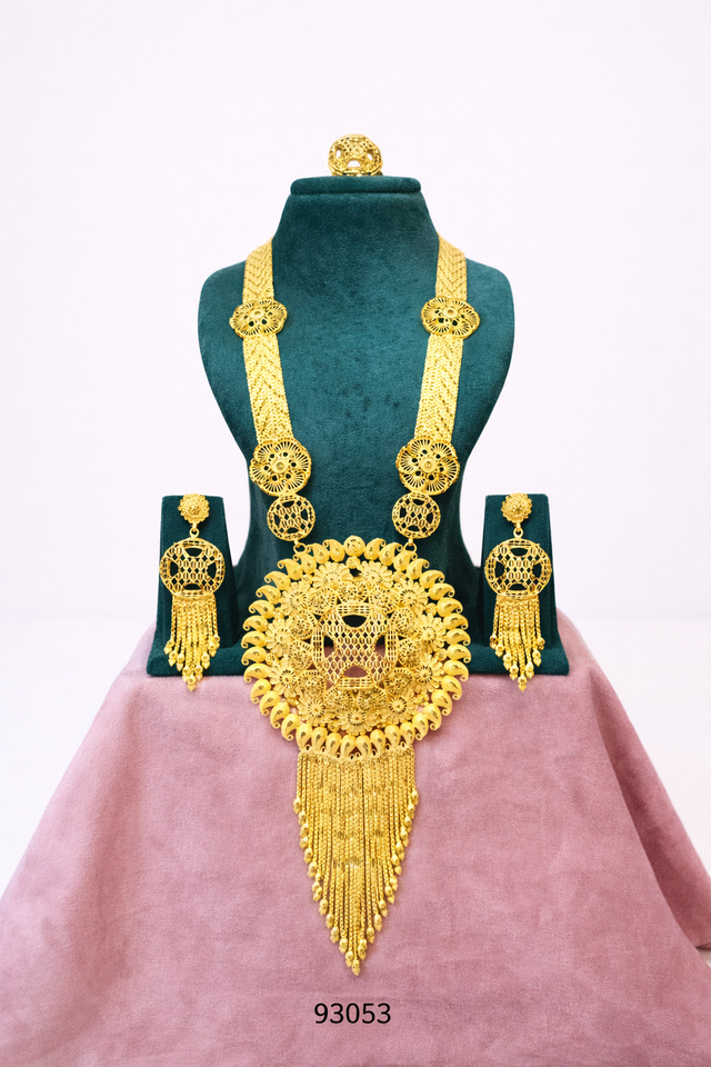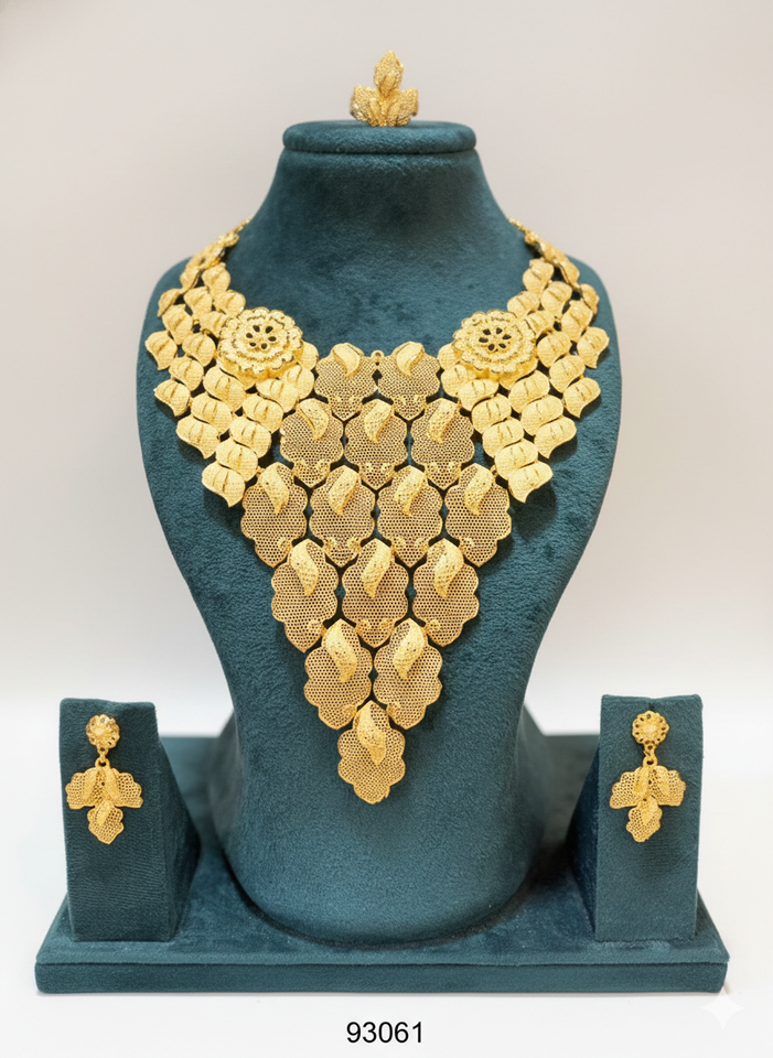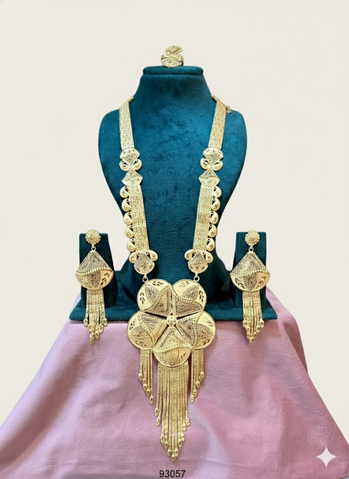 MOLL JEWELLERS Gold Filled 24k Trendy Long Necklace Set Large Floral Pendant Jhumka Earrings Ring ZIRCON Bridal Wedding Jewelry