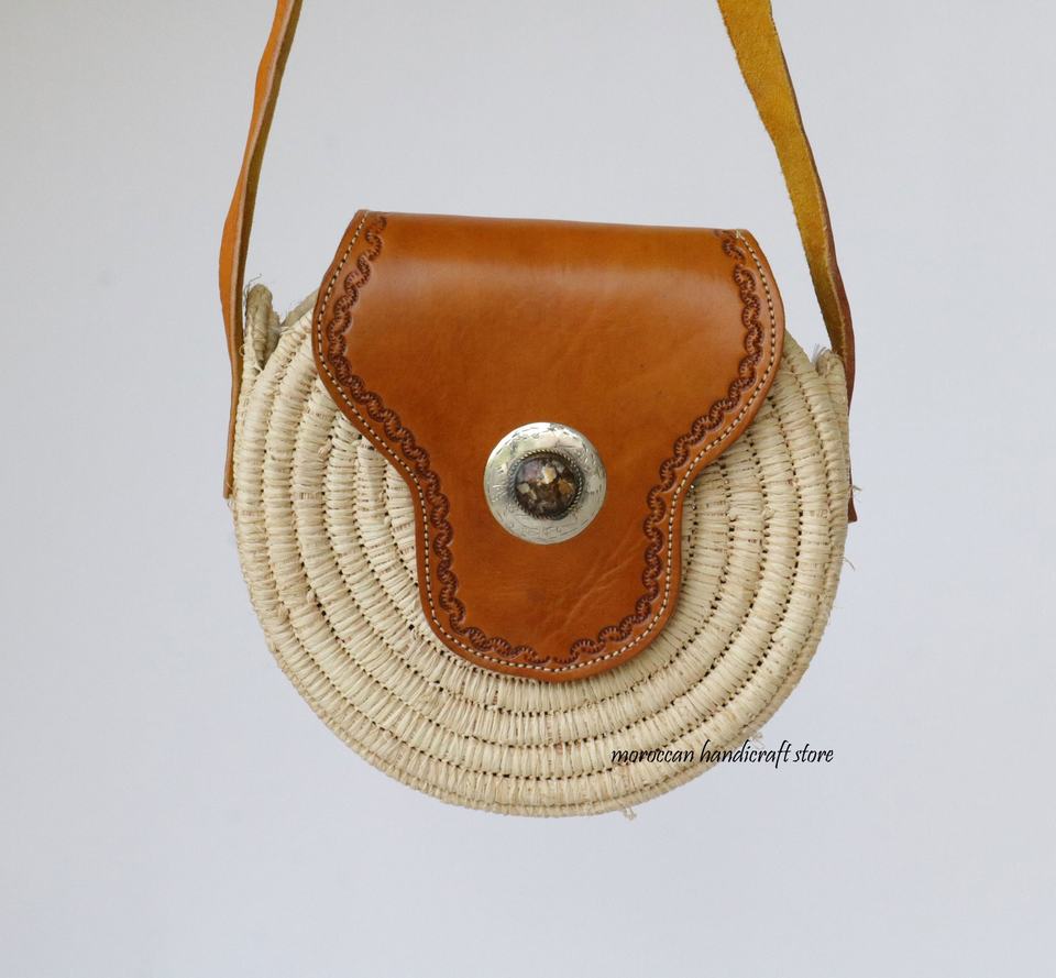 MOROCCO BLEU Stylish Genuine Leather & Palm Shoulder Bag Handmade Bucket Shape Geometric Pattern Unisex