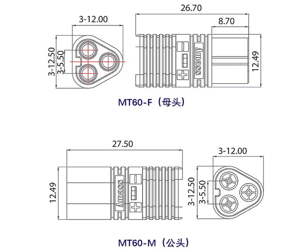 MT60-F MT60-M Series (3-Pin) Male & Female 30A-60A Connector Pair for Direct ESC to Motor and Battery Connection in RC Models
