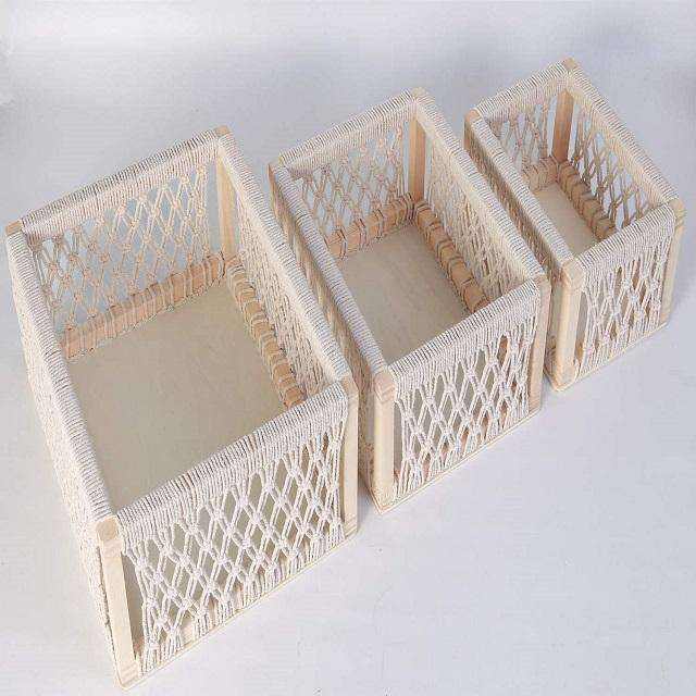 Macrame Cotton Rope Basket in Soft Natural Fiber with Wooden Handle Ideal for Stylish Home Organization and Storage