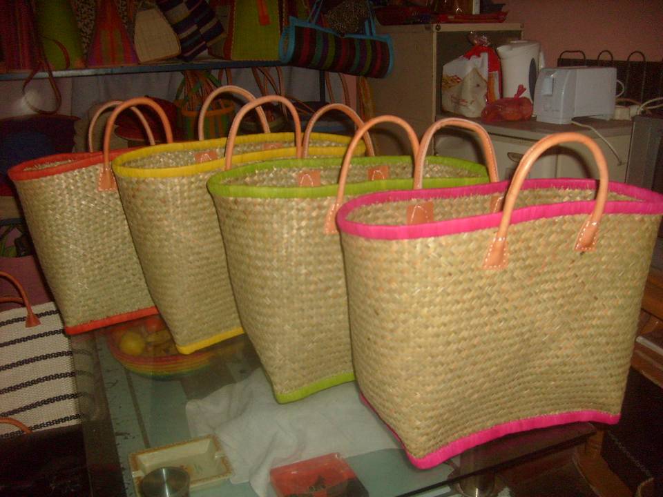 Madagascar Large Size Leather Handles Handbag with Raffia Pocket Inside Shopping Bag