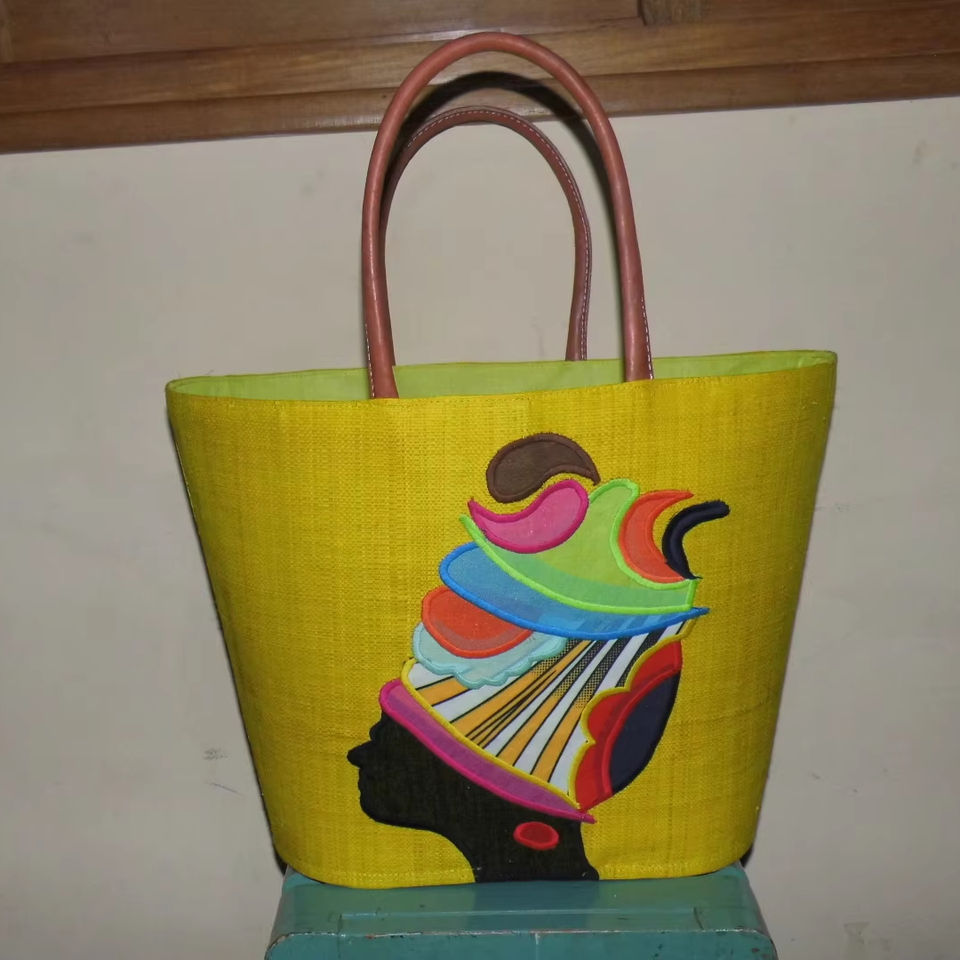 Madagascar Tote Bag Woven Straw Raffia Leather Handles Bottom Edge Dot Pattern African Fabric Hand Embroidered Beach Handbag