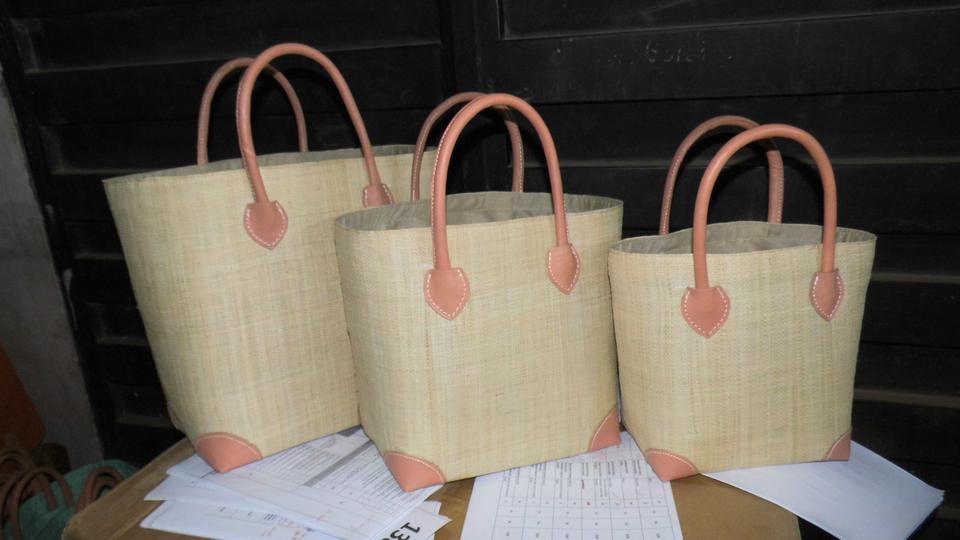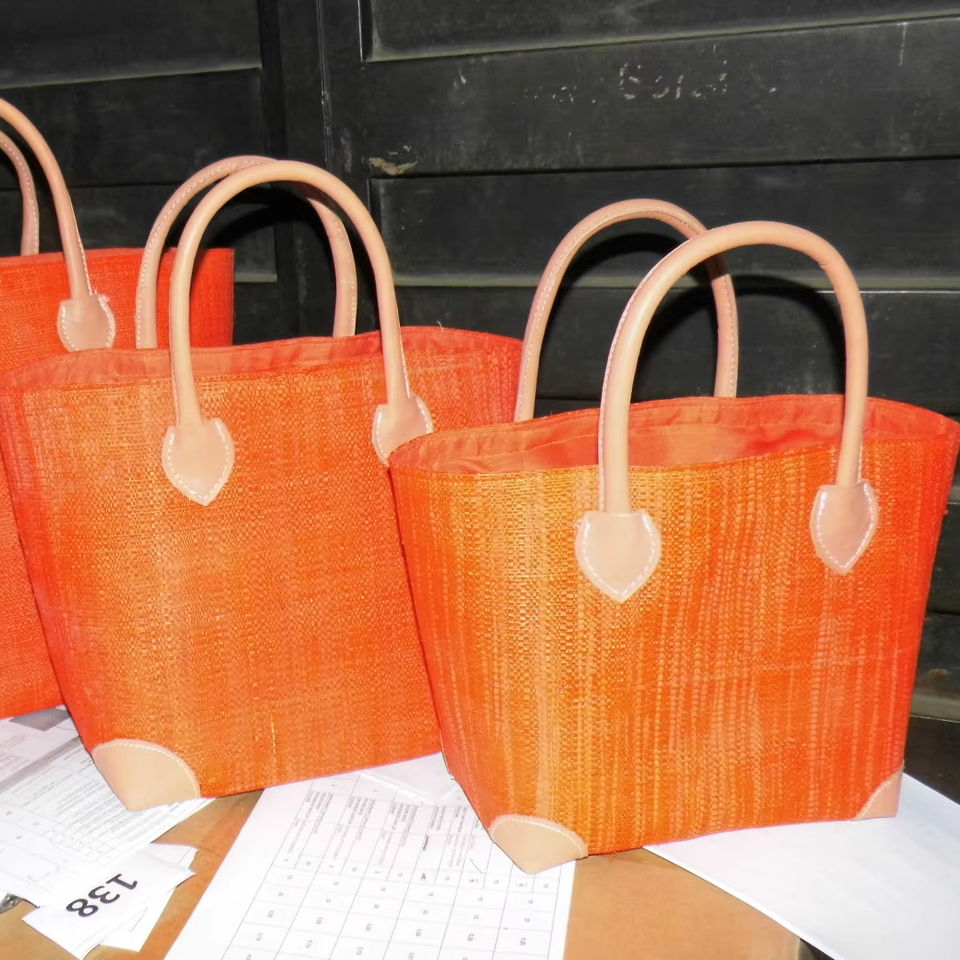 Madagascar Summer Fashion Handbag Zoma Raffia Tote Basket With Leather Handles and Corners Straw Material and Raffia Pocket