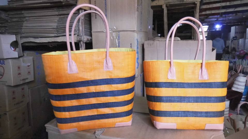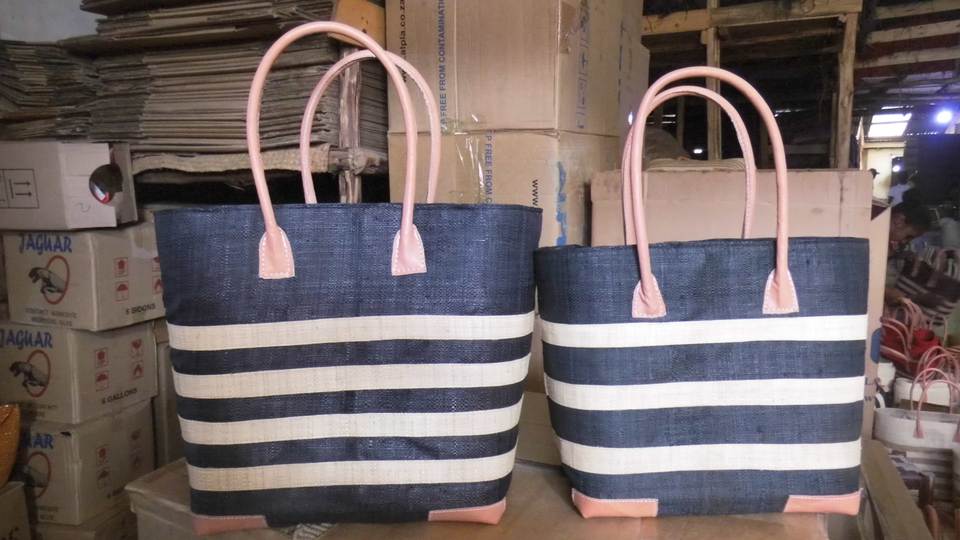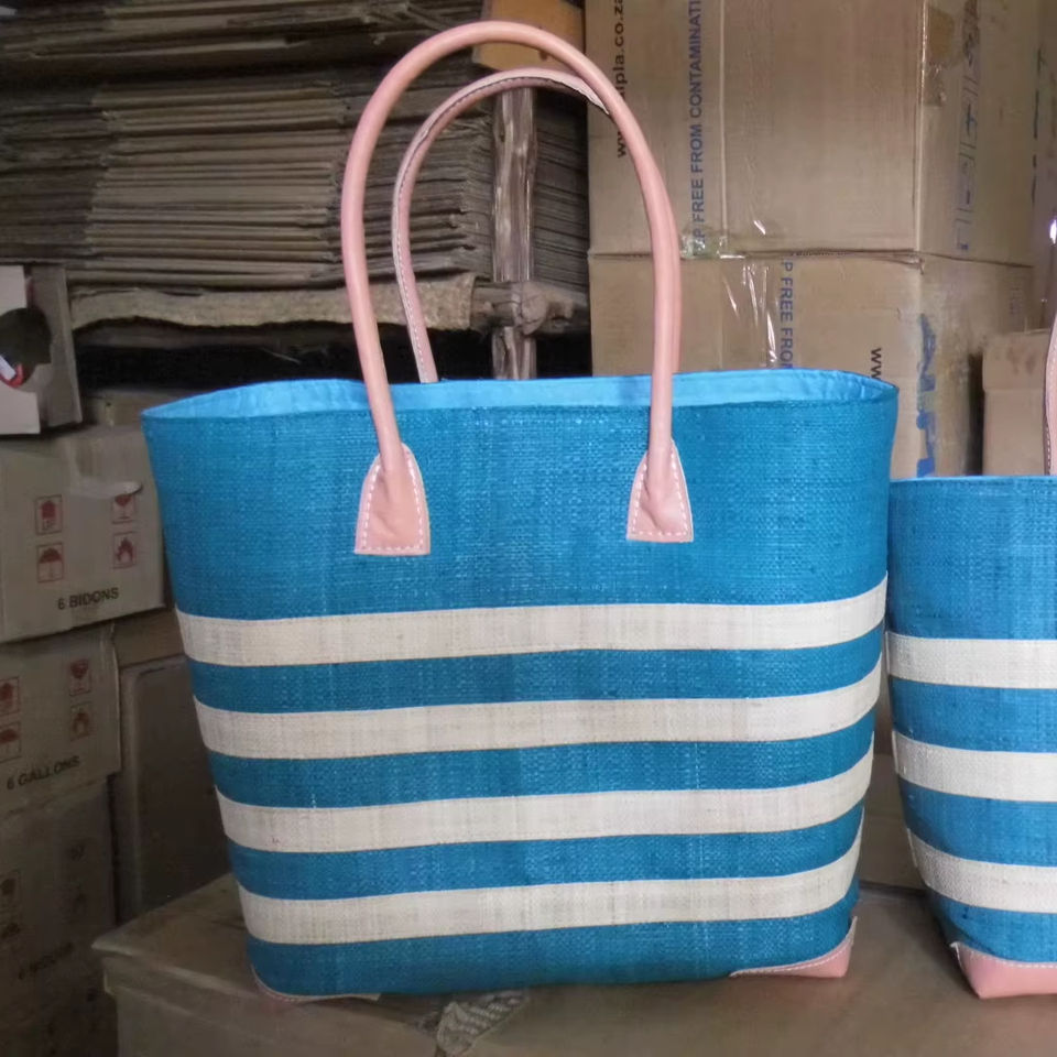 Madagascar Colored Leather Handles Drawstring Closure Striped Sisal Raffia Tote Handbag with Pompoms and Pocket Large Size