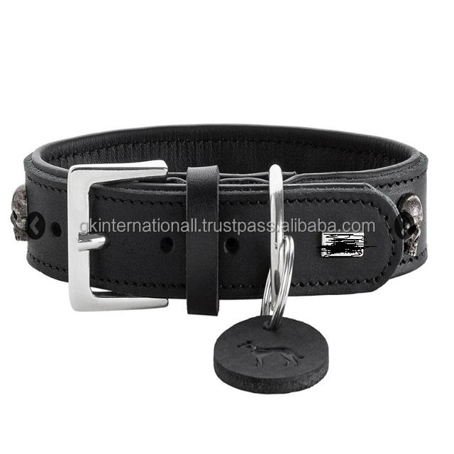 Made in India Double Ply Thick Saddle Leather Dog Collar Customized with Antique Skull studded Leather Pet Collar for All Size