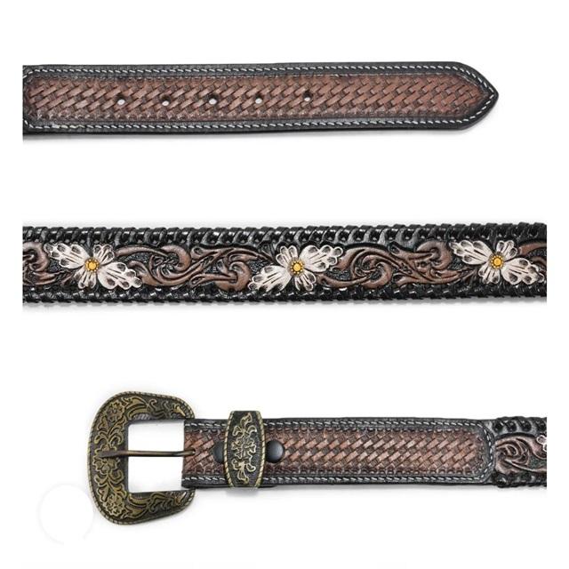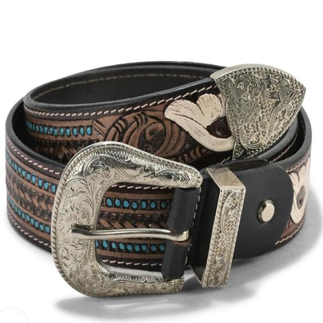 Made in India High Quality Floral Engraved Full Grain Vegetable Tanned Western Leather Tooling belt with 3 Piece Designer buckle