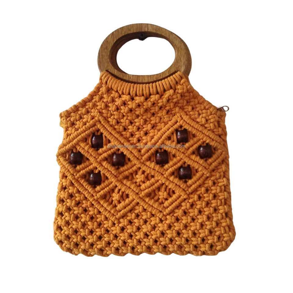 Made in India Macrame Carry Orange Color Bags New Collection of Macrame Hand Bag With Wooden Handle on Cheap Price
