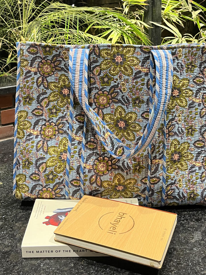 India-Made Eco-Friendly Quilted Floral Block Print Tote Bag Open Embroidered Customizable Winter Spring Travelers Beach Goers