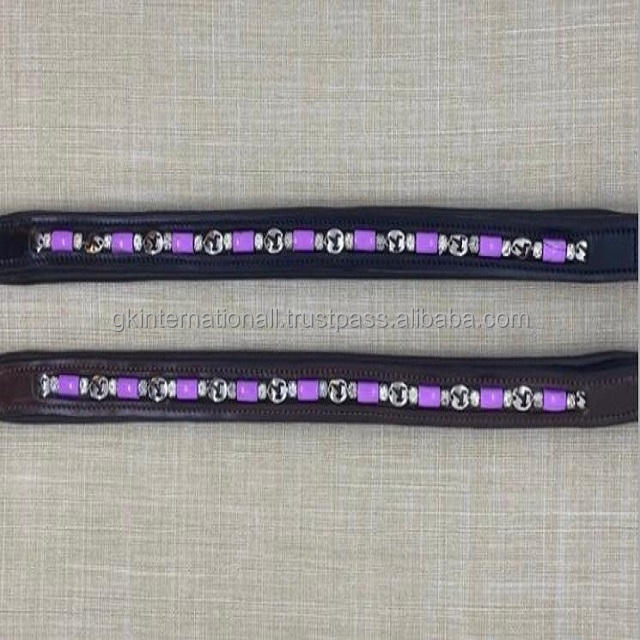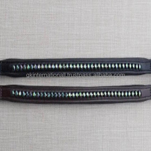 Made in India Handmade Empty Channel Leather Horse Brow Band Durable Edge Stitching & Padding With1row of Green Crystals Bling