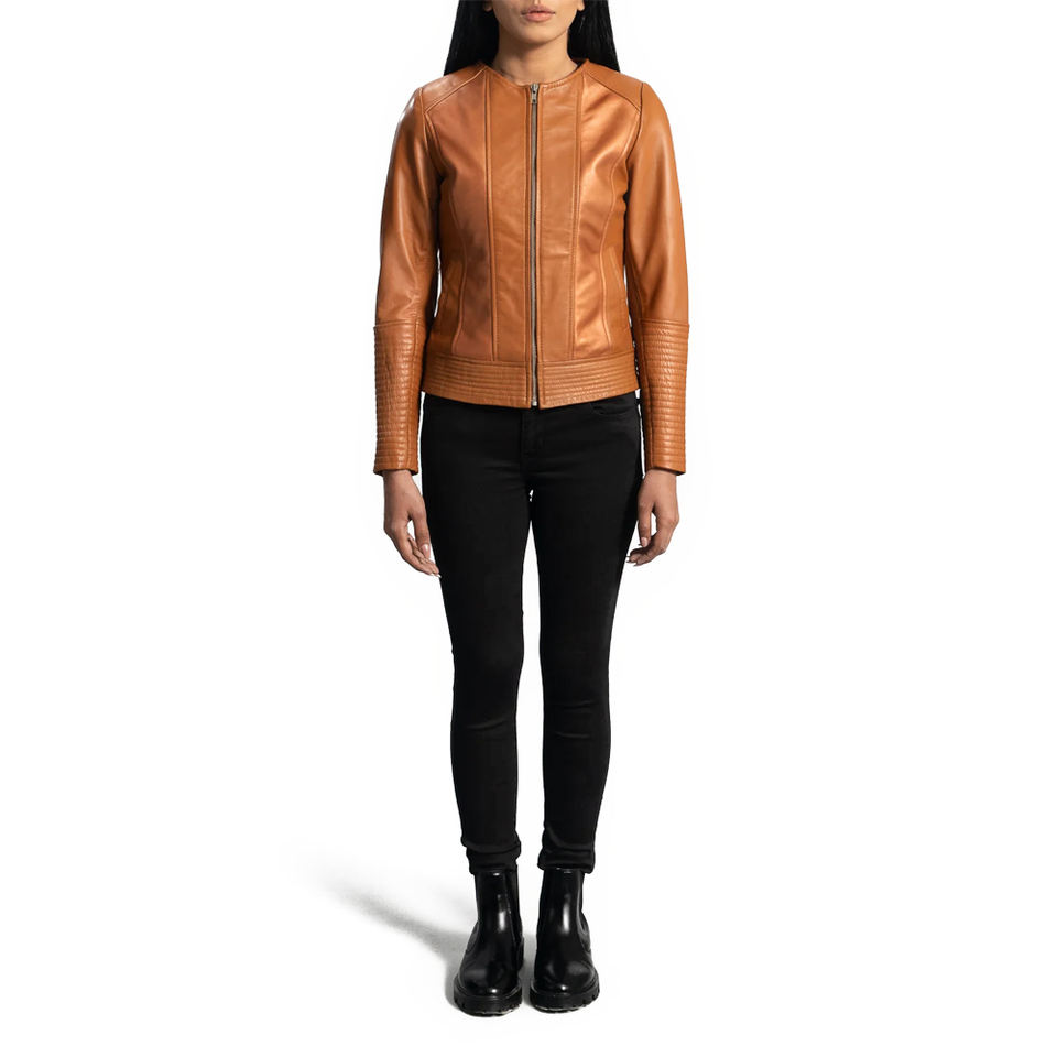 Made Order Custom Women's Tan Sheepskin Leather Biker Jacket Sleek Clean Design Zipper Cuffs Early Winter Finished High Quality