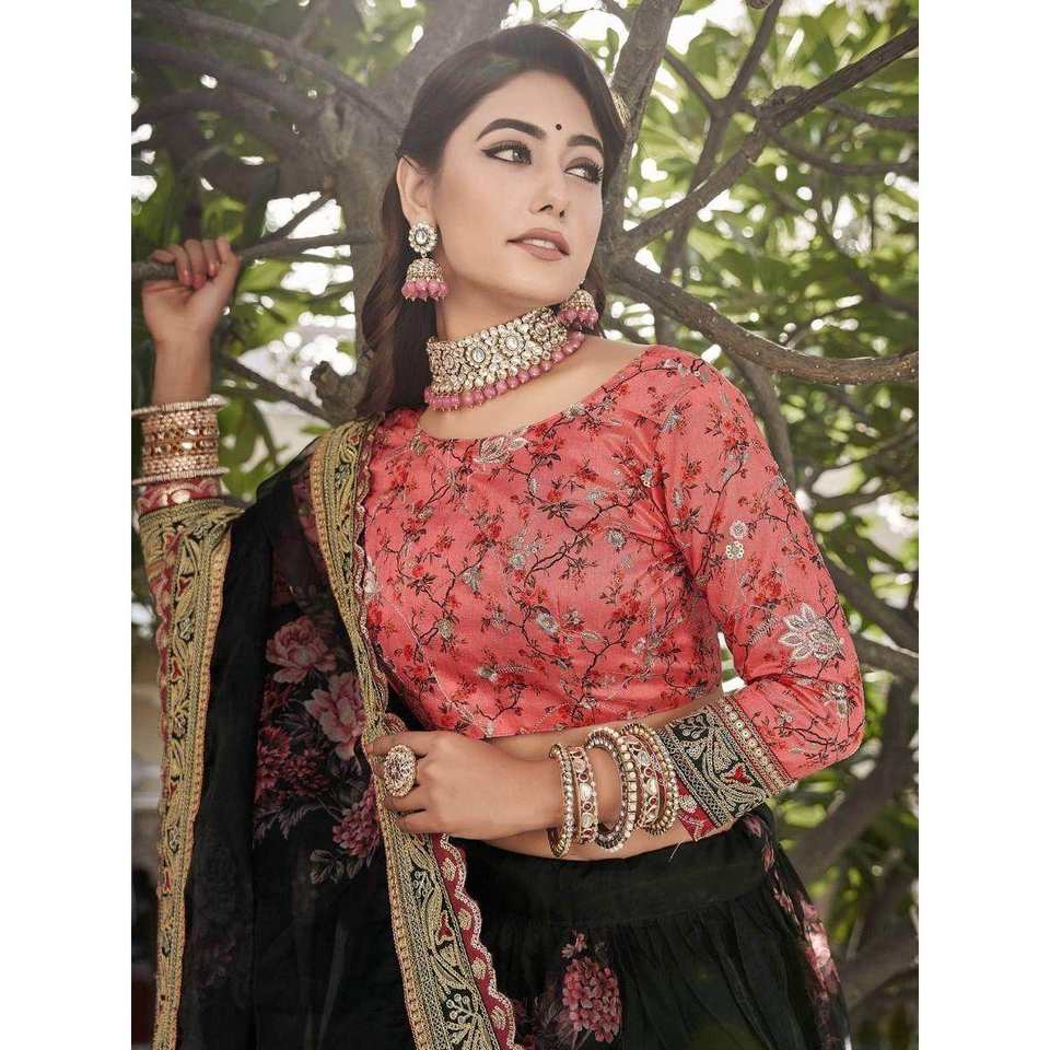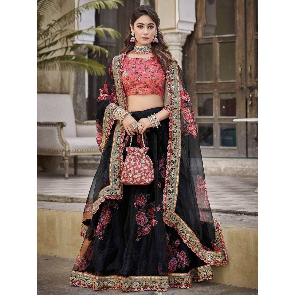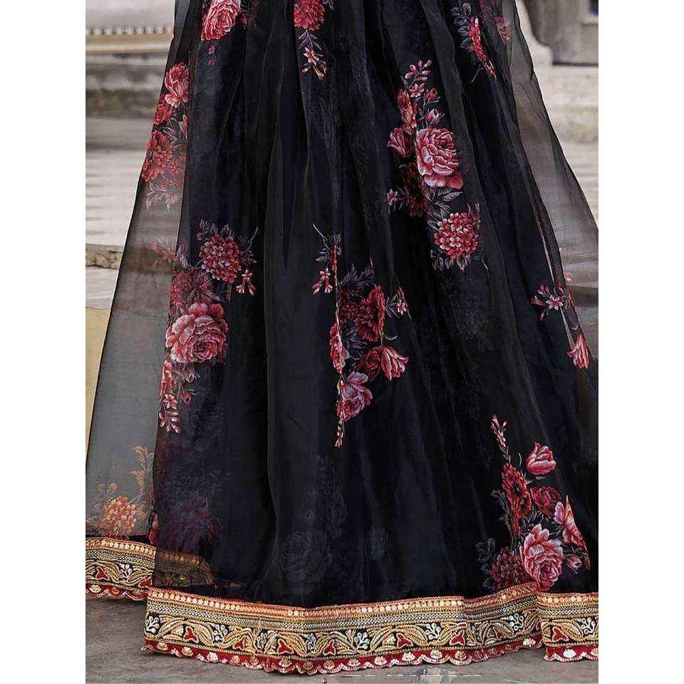 Magnetic Black Floral Printed Women's Lehenga Choli Traditional Wear Organza Set