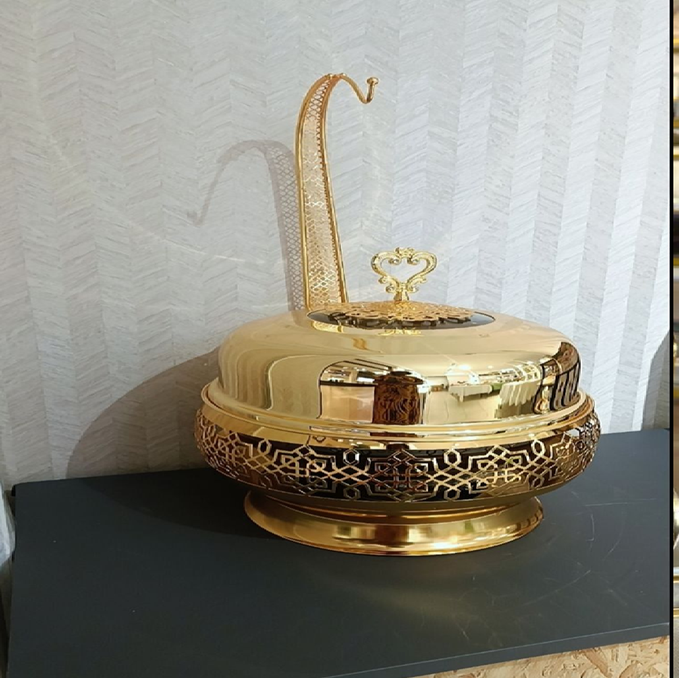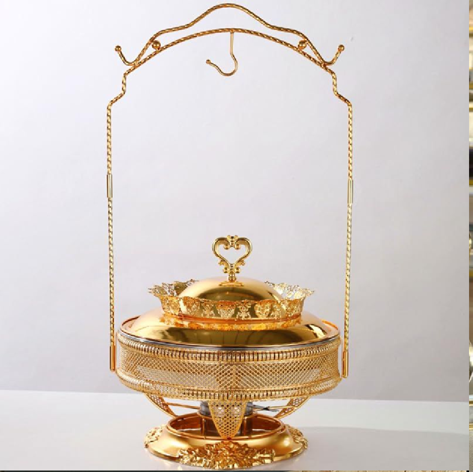 Majestic gold soup tureen with a lattice-patterned base and heart-shaped handle. Available at wholesale prices.