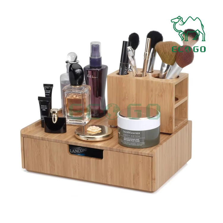 Makeup Cosmetic Storage Organizer With Bamboo Drawer Small Accessories Wooden Desk Organizer Bins