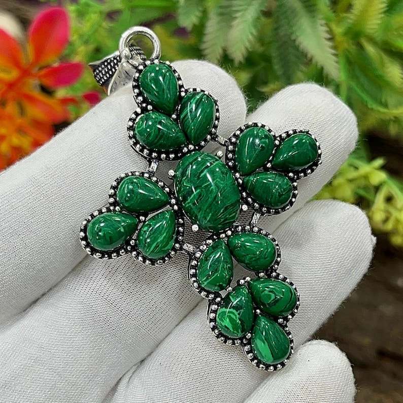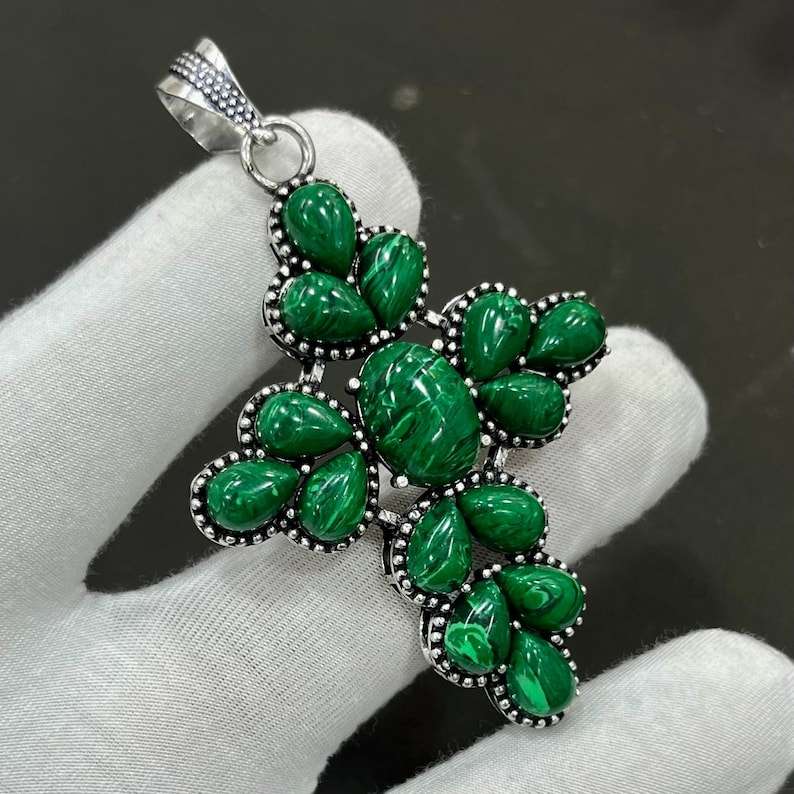 Malachite Sterling Silver Cross Pendant Handcrafted Gemstone Jewelry Fine Designer Religious Gift for Her Fashion Unique Design