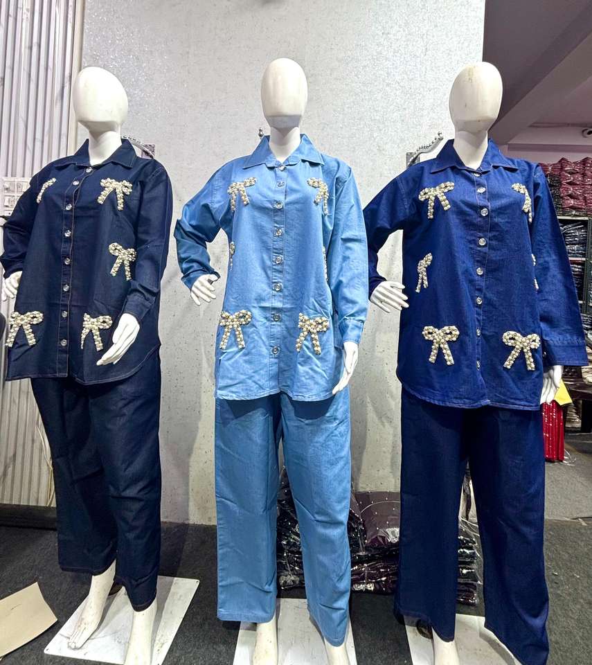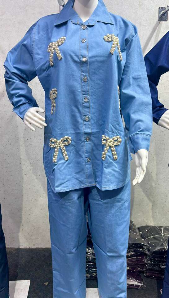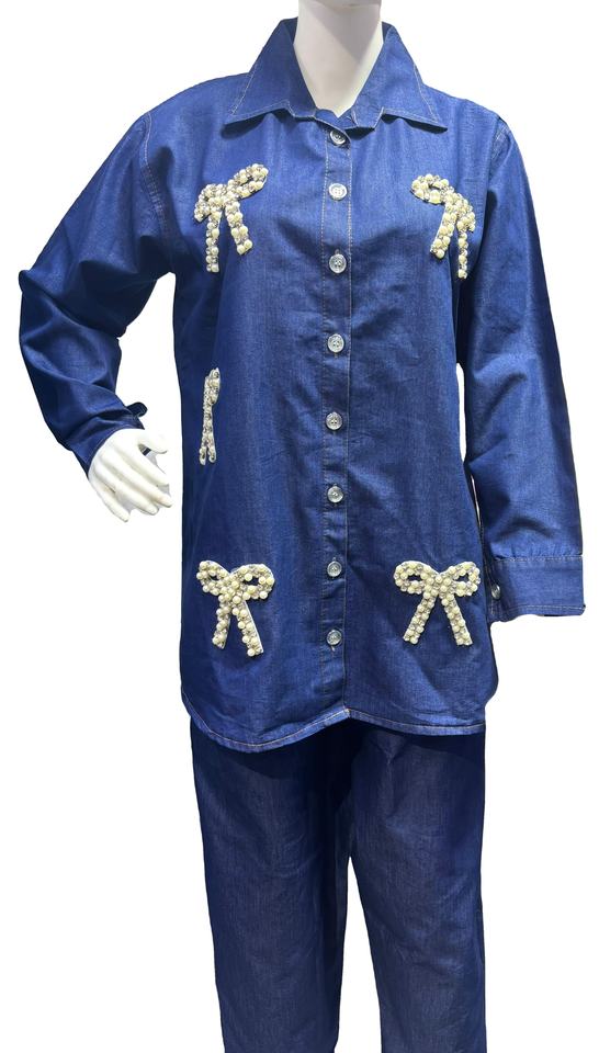 Malaysia New Release Modest Cord Set Handmade Clothing Denim Blouse Pant Two-Piece Women Coord Sets Breathable Design wholesale