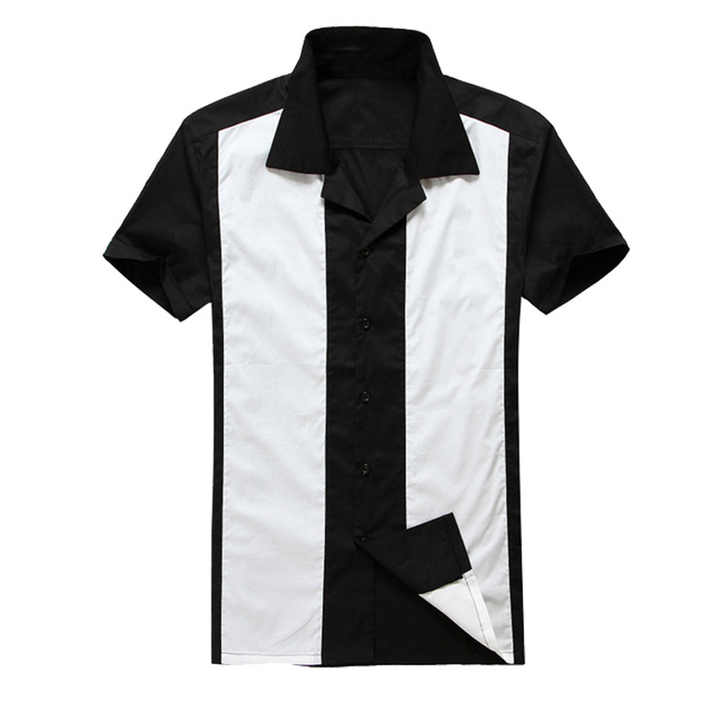 Male Clothing Short Sleeve Patchwork Rockabilly Style Casual Cotton Blouse Mens Bowling Dress Shirts