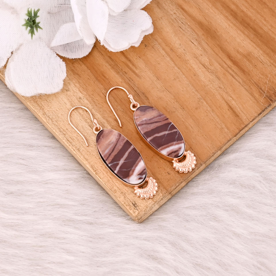 Malinga Jasper Oval Gemstone Handmade Designer Anniversary Gift Earrings Rose Gold Brass Dangler Fashion Jewelry for Women