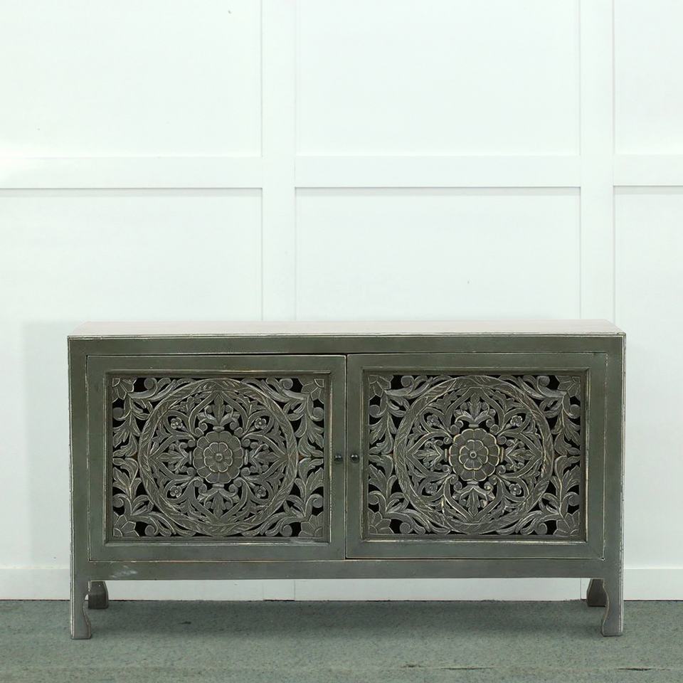 Mandala Floral Hand Carved Four Door Buffet Cabinet in Distressed Grey Finish of Solid Mango Wood With Rustic Antique Look