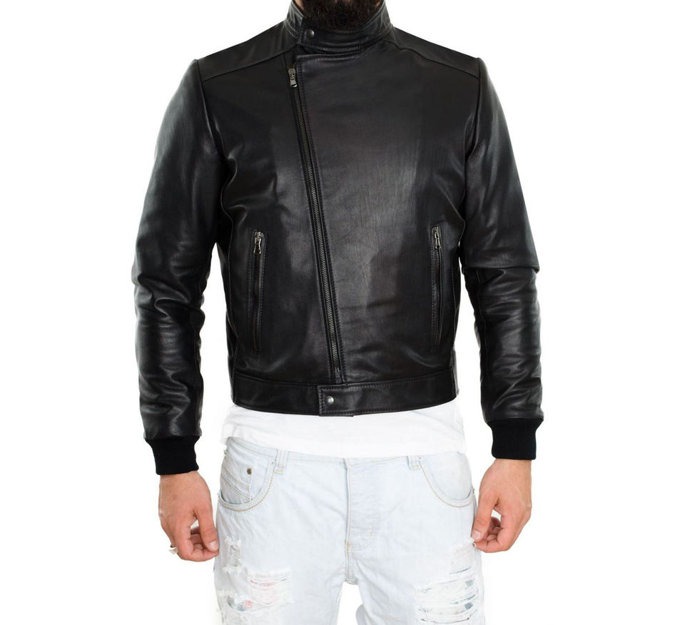 Mandarin Collar Genuine Leather Jacket Black Color Men Fabric Lining Zip Closure Plus Size Men's Jackets